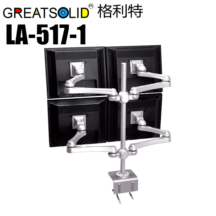 格利特LA-51多屏系列 复合式4屏显示器支架 LA-517-1/LA-527-1 承重32kg夹具式组合型万向移动电脑支架,用于个人办公,金融监控,工厂车间,产品展示,医疗设备,特殊作业等领域,具有多关节多角度和移动范围偏转变换,本产品利用人体工学原理制造,体现人性化的办公模式