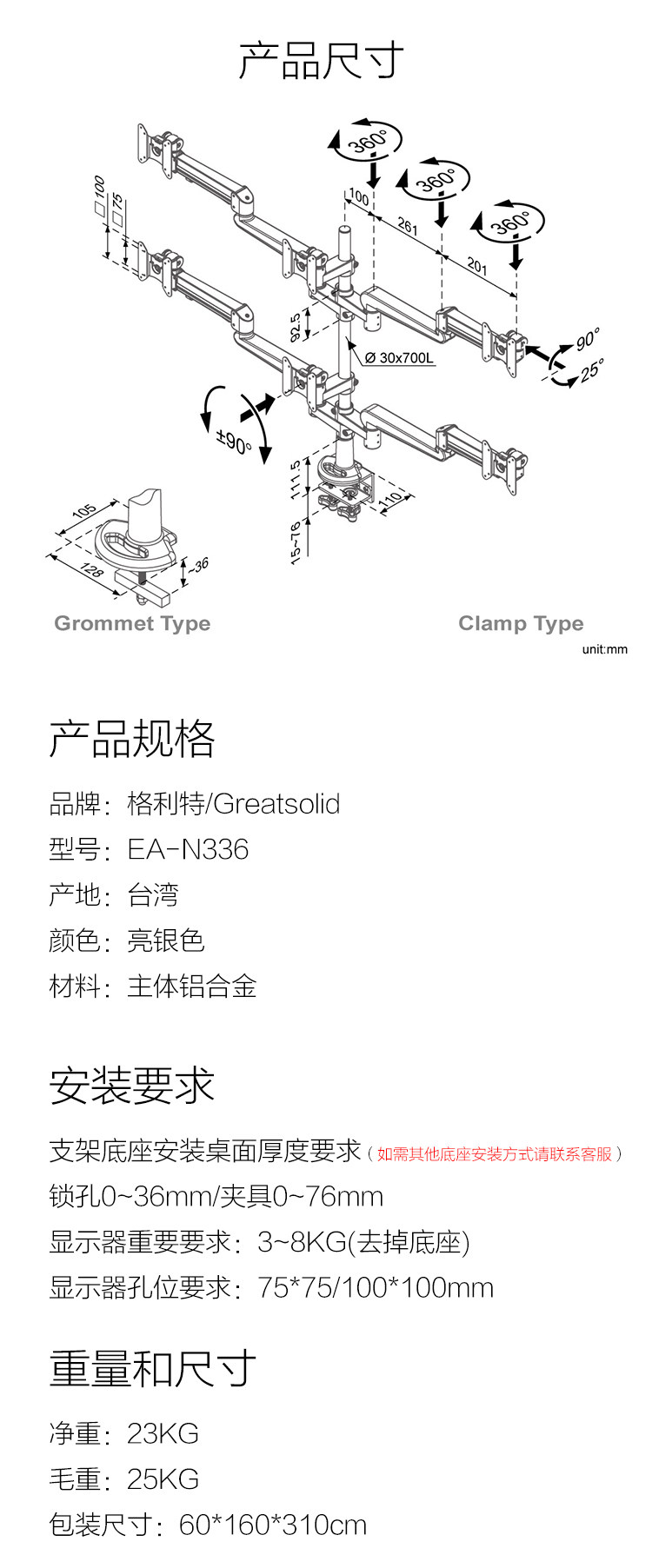 新品上市!Greatsolid格利特EA-N336六屏显示器支架