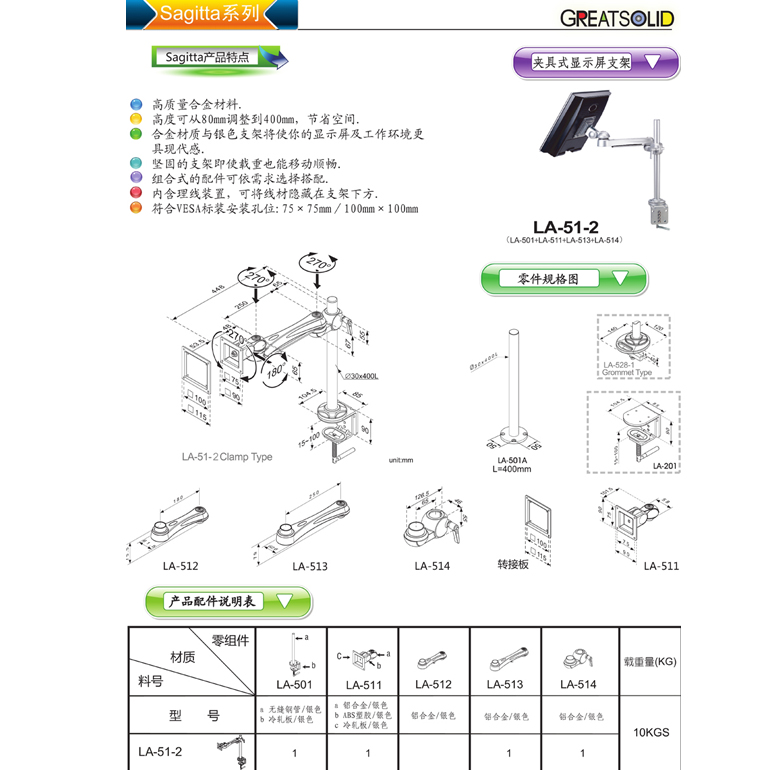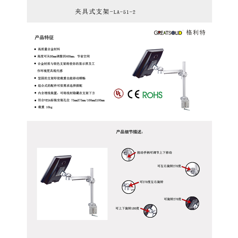 格利特显示器支架 LA系列LA-51-2 多关节组合型显示器移动支架 夹具式承重10KG显示器万向支架,用于个人办公,金融监控,工厂车间,产品展示,医疗设备,特殊作业等领域,具有多关节多角度和移动范围偏转变换,本产品利用人体工学原理制造,体现人性化的办公模式