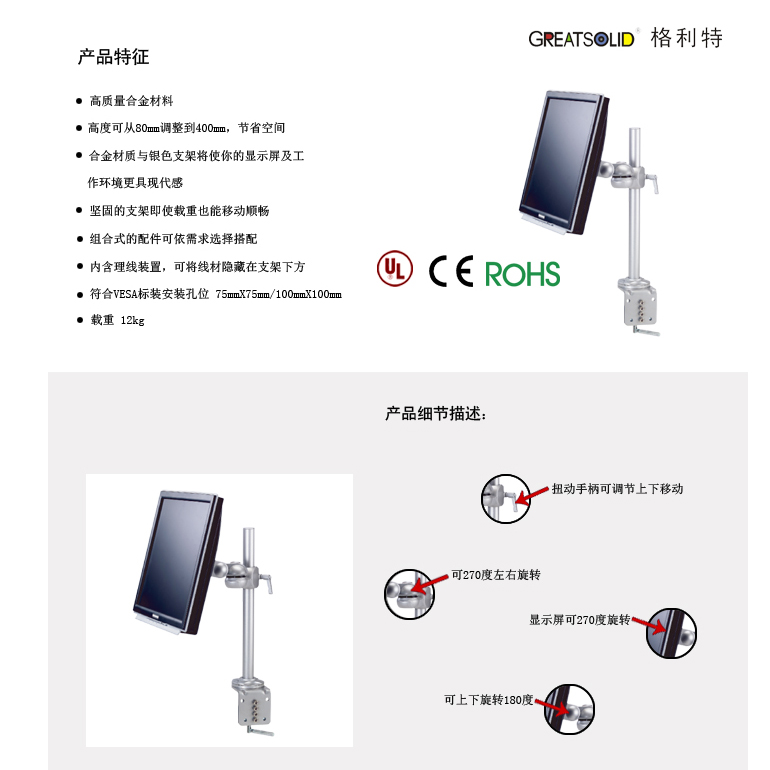 屏幕可旋转270度,上下180度,左右270度,支架上下行程80-400mm